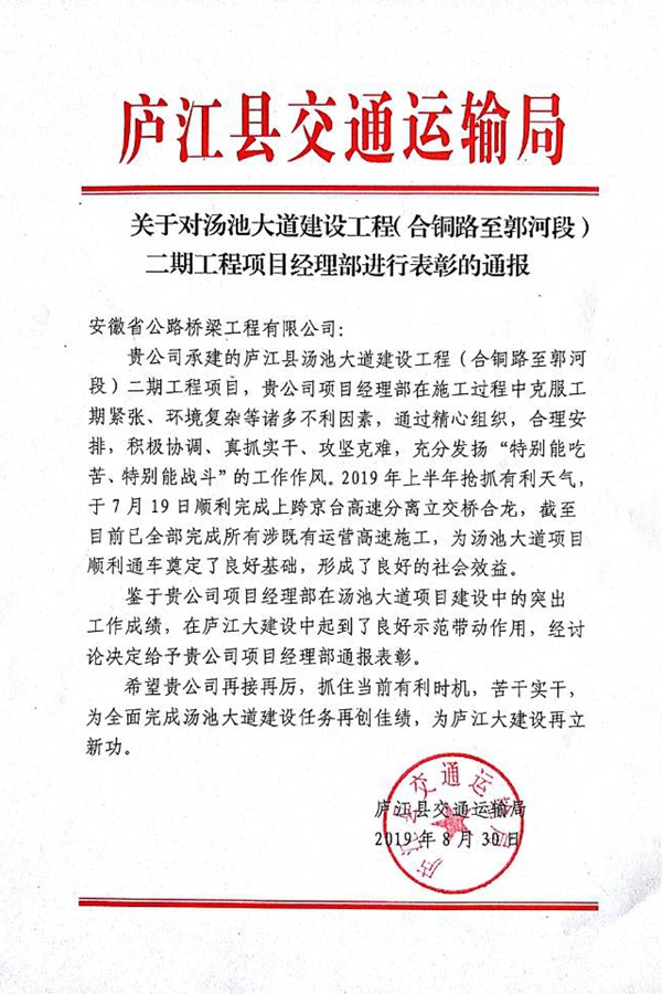 近日,庐江县交通运输局发文对汤池大道二期、郭柯路两项目进行通报表彰,高度肯定了项目团队管理水平及工程形象进度等工作。