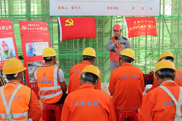 4月29日,繁华大道桥项目邀请全国劳动模范王开库开展党史学习教育进班组活动,为一线工人宣讲党史故事。