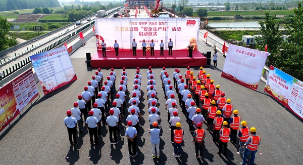 6月1日上午,道路分公司2021年“安全生产月”启动仪式暨“学党史、办实事、筑安全、促生产” 主题党日活动在合宁改扩建滁河大桥施工现场成功举办。公司党委委员、副总经理杜海峰出席活动并宣布“安全生产月”启动,分公司领导班子、后勤部门负责人,省内各项目经理、支部书记及安全部长,肥东片区项目党员、团员青年及一线工人代表共计百余人参加活动。