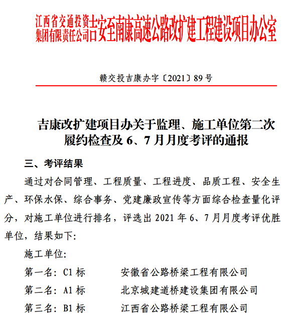 8月8日,吉康改扩建项目办公布了2021年6、7 月考评结果,公司承建的吉康改扩建C1标连续两个月获月度综合考核第一名。