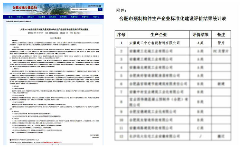 5月6日,合肥市城乡建设局发文通报,安徽建工中仑智能制造有限公司以全市第一名的成绩荣获2023年度合肥市装配式建筑预制构件生产企业标准化建设评价A类评价。这是中仑公司自成立以来,连续两次荣获该类别A类评价。