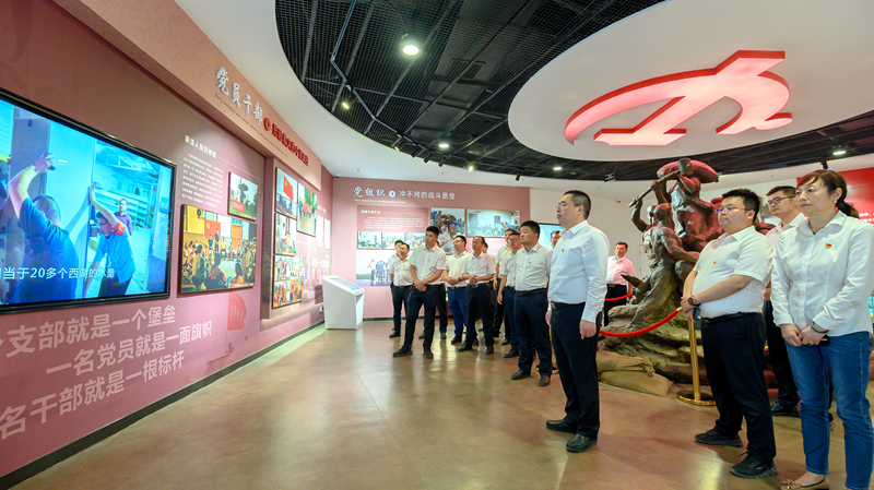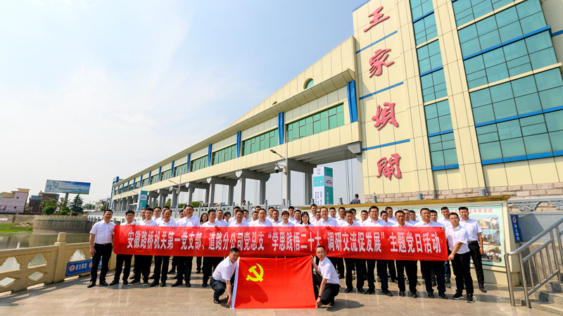 在调研交流环节,全体人员先后参观了项目预制梁场、阜南南互通施工现场,实地查看了项目标准化建设、安全文明施工和技术工艺运用情况,并在项目会议室围绕推动党建生产深度融合、加强人才队伍建设和深化项目基础管理等方面开展了座谈交流。在参观践学环节,全体人员来到被称为“千里淮河第一闸”的王家坝闸,重温习近平总书记考察安徽重要讲话指示精神。在讲解员的带领下,大家通过观看《王家坝纪录片》和参观王家坝抗洪纪念馆内的7个展厅,全面了解蒙洼群众的抗洪历史,深入领会王家坝精神的丰富内涵。