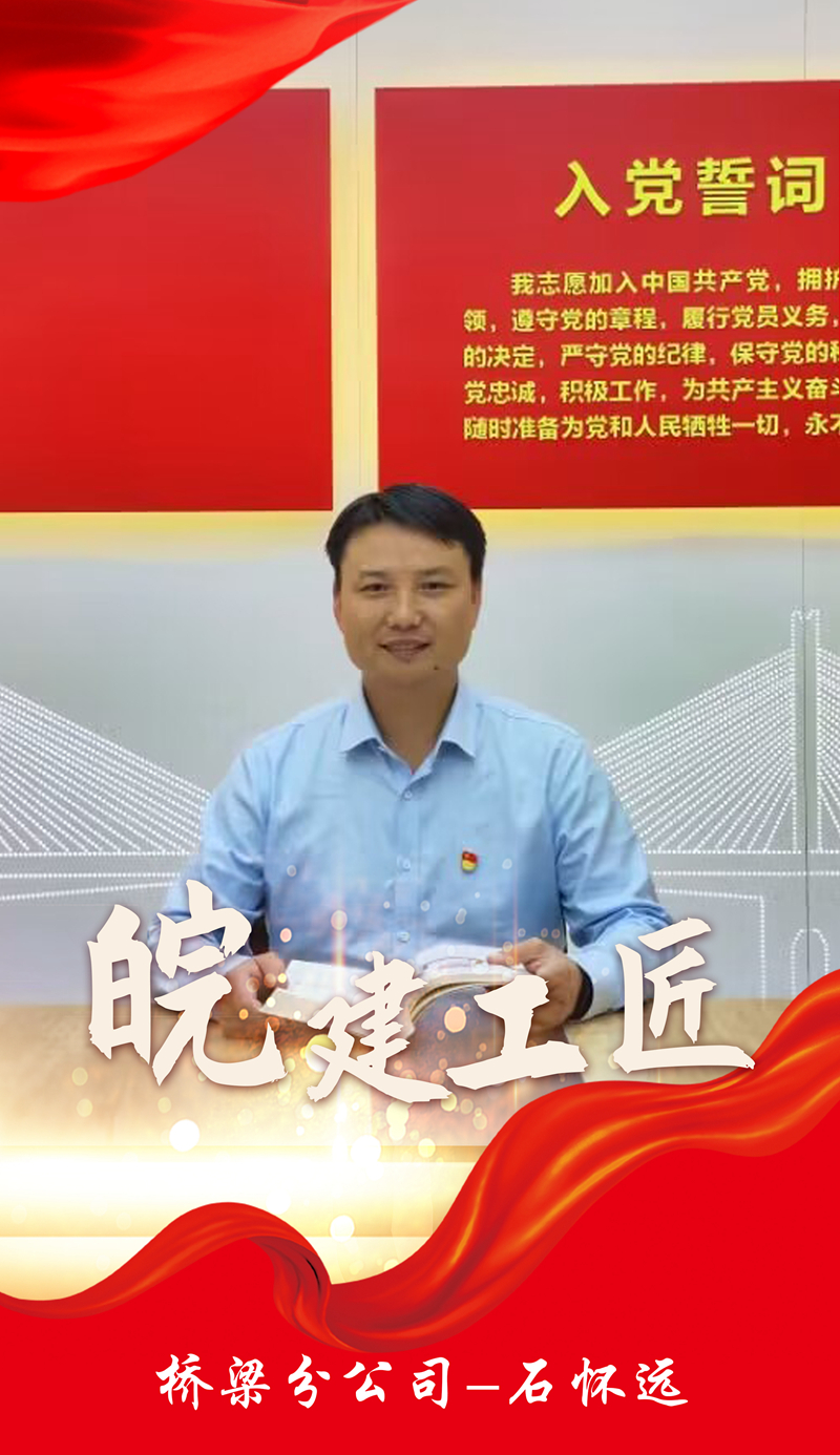 石怀远,桥梁分公司党总支书记、总经理。扎根工程施工一线17年,先后参与建设六安淠史杭大桥、济祁高速淮河特大桥等一大批省、市重点工程项目。他秉承精益求精、追求卓越的工匠精神,解决了一个个施工技术难题,培养了一批公路和桥梁工程施工领域专业技术人才,用实际行动和出色的工作业绩践行了劳模精神、劳动精神、工匠精神。
