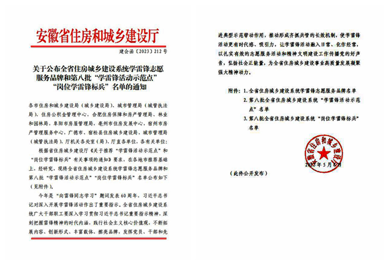 近日,安徽省住房和城乡建设厅公布了第八批全省住房城乡建设系统“岗位学雷锋标兵”名单,表彰一批乐于奉献、自觉践行雷锋精神的岗位标兵。公司职工石怀远、赵玉珠获此殊荣。