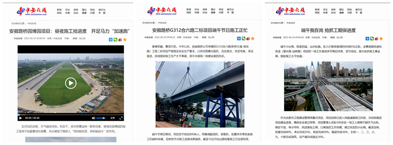 端午期间,中安在线、《合肥新闻联播》等媒体聚焦公司园博园项目、G312合六路二标、金寨南路快速化改造(望水路-站前路)等重点项目建设,深度报道项目端午坚守岗位,奋力抢抓施工黄金期,掀起施工大干热潮的建设情况。