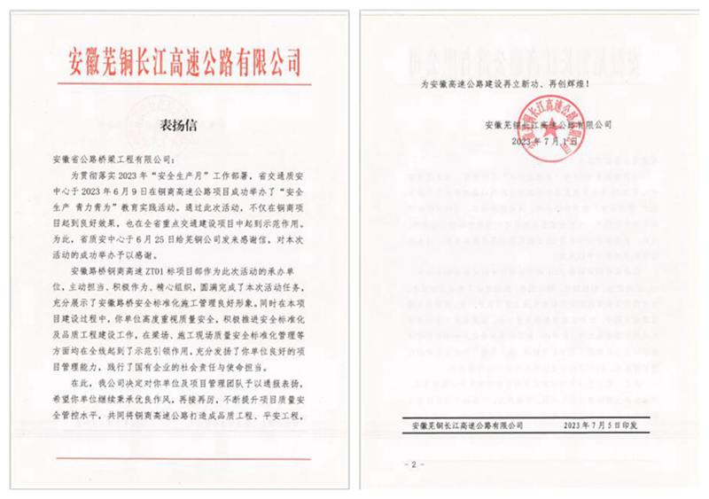 公司获安徽芜铜长江高速公路有限公司来信表扬