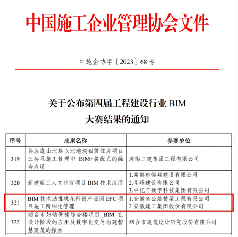 近日,全国第四届工程建设行业BIM大赛结果揭晓,公司申报的《BIM技术助推桃花科创产业园EPC项目施工精细化管理》在3153项参赛成果中脱颖而出,荣获建筑工程综合应用类三等奖,此次获奖是公司再次获得国家级BIM技术应用奖项。