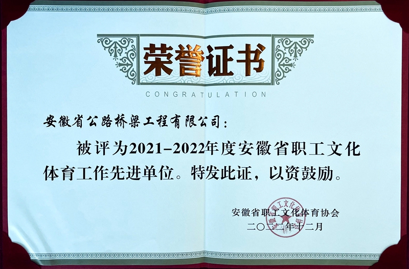 近日,安徽省职工文化体育协会发布了《关于表彰安徽省职工文化体育工作先进单位的通报》,授予安徽省公路桥梁工程有限公司等13家企事业单位“2021-2022年度安徽省职工文化体育工作先进单位”称号。