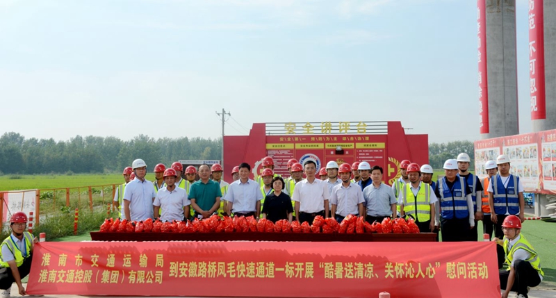 8月11日下午,淮南市交通运输局党组成员、副局长潘理想到凤毛快速通道01标项目开展“送清凉”慰问活动。