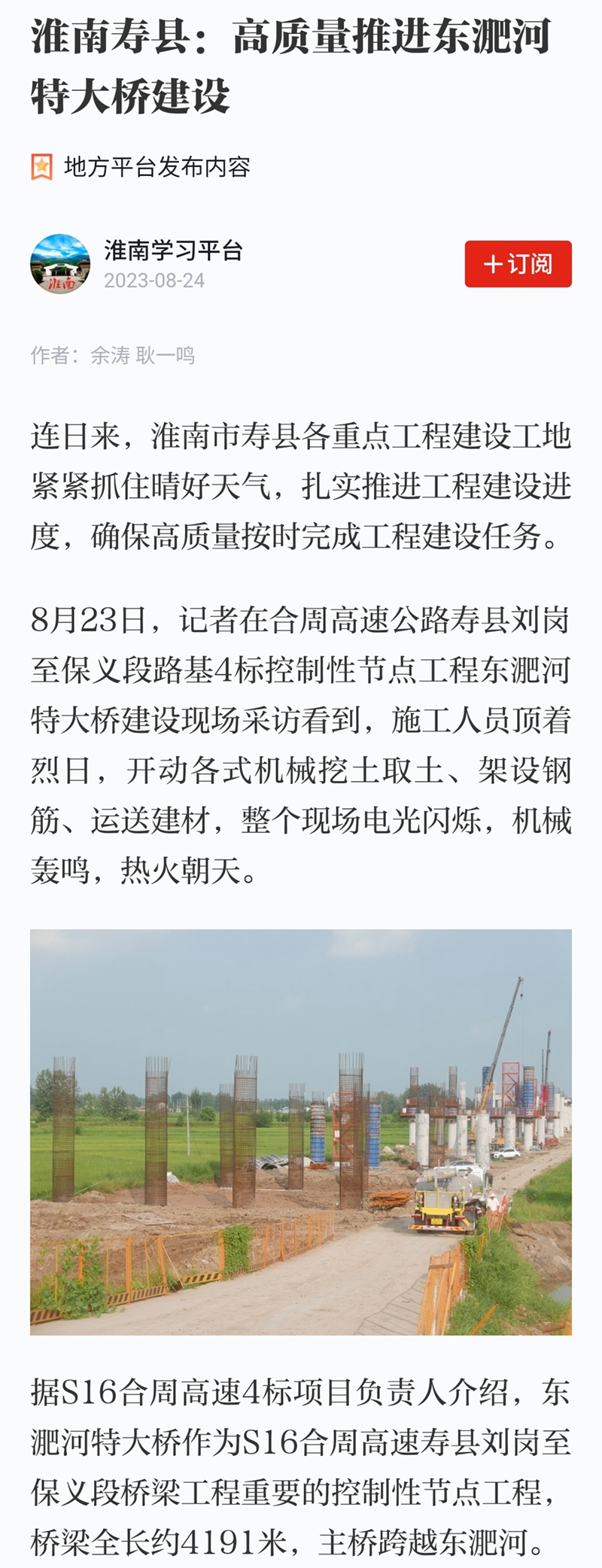 【名媒聚焦】学习强国——安徽路桥:高质量推进东淝河特大桥建设