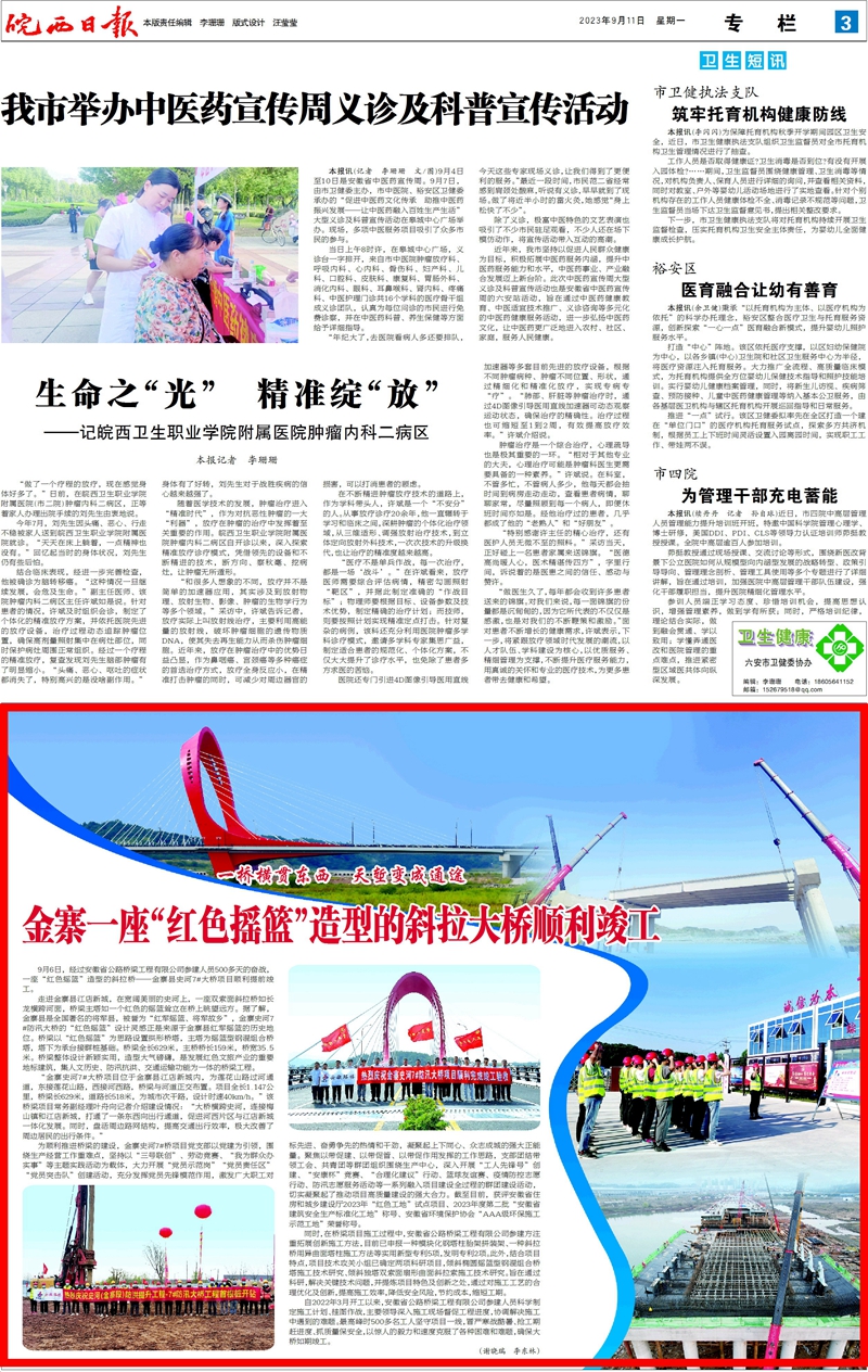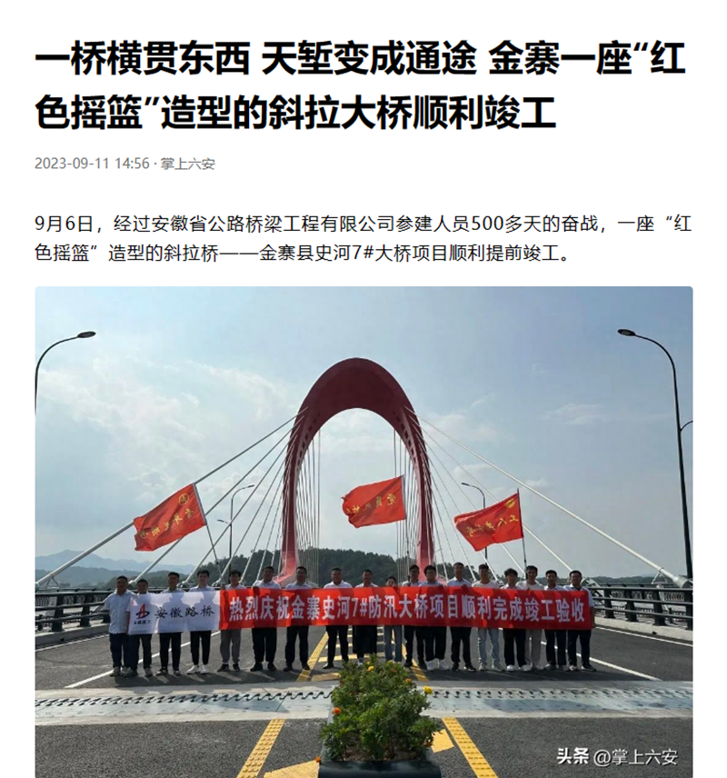 【名媒聚焦】皖西日报、今日头条:一桥横贯东西 天堑变成通途——金寨一座“红色摇篮”造型的斜拉大桥顺利竣工