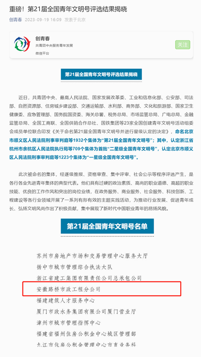 9月19日,共青团中央、住房城乡建设部等23家全国创建青年文明号活动组委会成员单位联合印发《关于命名第21届全国青年文明号并进行星级认定的决定》,发布“第21届全国青年文明号”获评名单。安徽路桥市政分公司荣耀登榜,是继荣获“2017-2018年度全国青年文明号”之后再次获此殊荣,同时被认定为首批“二星级全国青年文明号”。