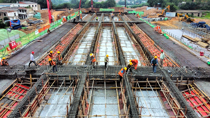 中秋、国庆“双节”期间,在信阳市新十一大道项目施工现场,数百名工人和几十台大型机械正在紧张有序地进行钢筋绑扎、梁板浇筑等施工作业,项目全体建设者不畏艰难、顽强拼搏,用激情和汗水诠释责任和担当,用专业和实干诠释“路桥皖军”品牌。