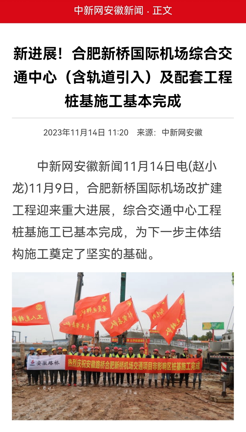近日,公司承建的合肥新桥国际机场改扩建项目迎来新进展,综合交通中心工程桩基施工完成,为下一步展开主体结构建设奠定坚实基础。央视网、中新网、中国建设报、安徽交通广播、合肥日报、合肥新闻等多家中央和省市级主流媒体持续关注报道。