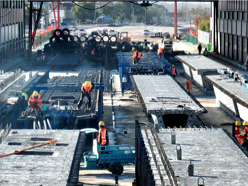 11月22日下午,记者在安徽路桥承建的G329孙埠至大汪村一级公路改建工程施工现场看到,该工程4号桥部分桥面已完成浇筑,工人正在铺设土工布进行养护。与此同时,另一段桥面上,工人忙着焊接钢筋,为随后的混凝土浇筑做好准备。不远处的预制梁场内,工人繁忙有序地操作着机器,一排排预制梁正在制作,一派如火如荼的建设场景。