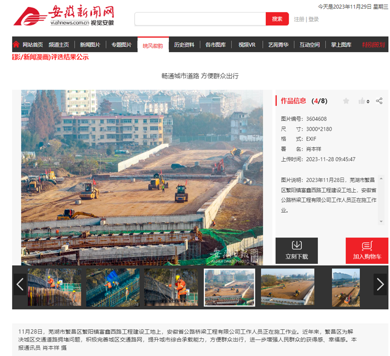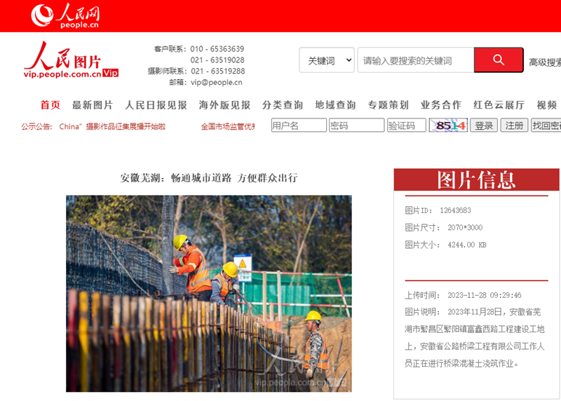 11月28日,中国新闻图片网、人民网、安徽新闻网等多家央媒和省级媒体关注公司承建的繁昌区富鑫西路项目工程建设,以图组形式聚焦项目桥梁混凝土浇筑和路基施工。