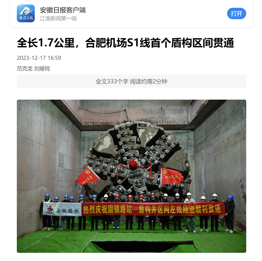 近日,公司承建的合肥新桥机场S1线固镇路站至合肥西站盾构井区间左线隧道顺利贯通。作为S1线首个实现贯通的区间隧道,受到人民网、安徽日报、大皖新闻等多家主流媒体关注报道。