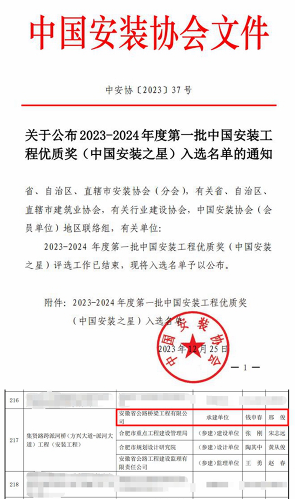 12月25日,中国安装协会公布了2023-2024年度第一批中国安装工程优质奖(中国安装之星)入选名单,公司承建的集贤路跨派河桥(方兴大道-派河大道)工程榜上有名。此项目是中国安装工程优质奖(中国安装之星)历年获奖项目中首个市政桥梁项目,也是公司首个获得中国安装工程优质奖(中国安装之星)的项目。