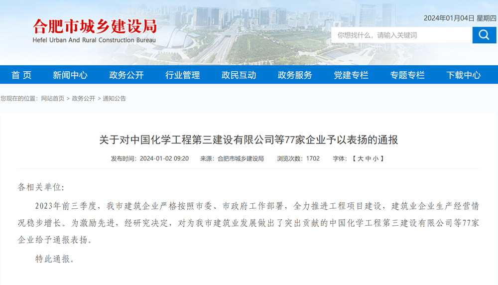 近日,合肥市城乡建设局为鼓励先进,对为合肥市建筑业发展做出突出贡献的77家单位进行了表扬,公司名列其中。