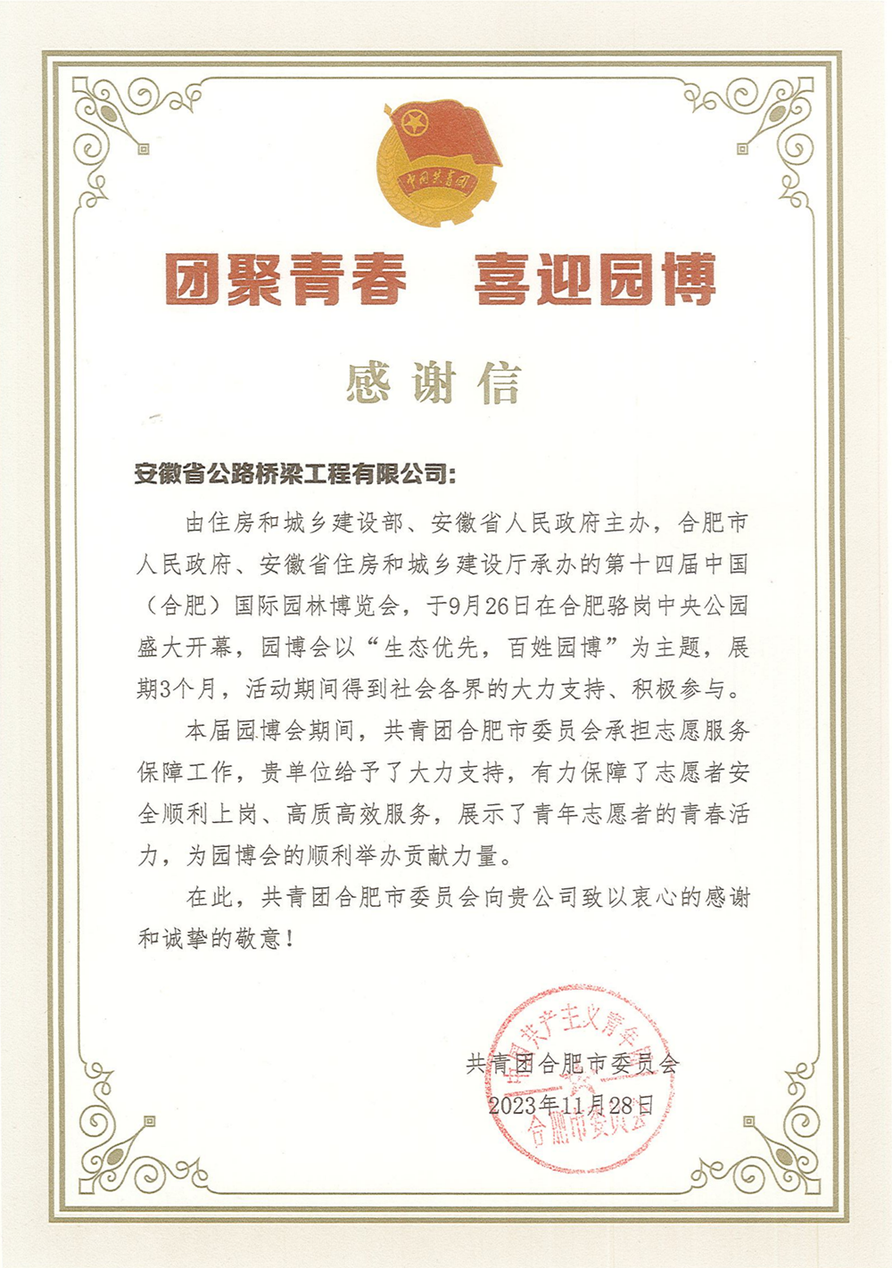 2023年5月至9月,公司集聚优势资源,承建园博园机场跑道修复及相关配套项目,高效完成各项施工任务,为老机场跑道换上“新衣”,助力园博盛会精彩开幕。同时,在园博会期间,积极响应合肥团市委号召,组织招募青年志愿者,为园博会期间的各项活动做好服务保障工作,展现了新时期安徽路桥青年志愿者的风采。