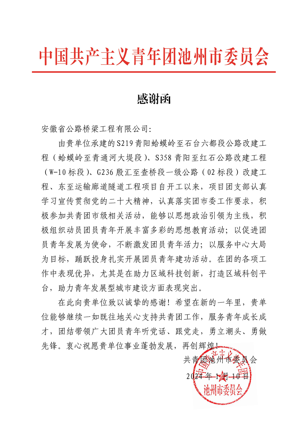 1月10日,公司收到共青团池州市委感谢函,对S219青阳蛤蟆岭至青通河大堤段改建等4个项目坚持党建带团建,服务生产经营工作,尤其是助力打造区域科创平台,助力青年发展型城市建设方面的突出贡献给予感谢。