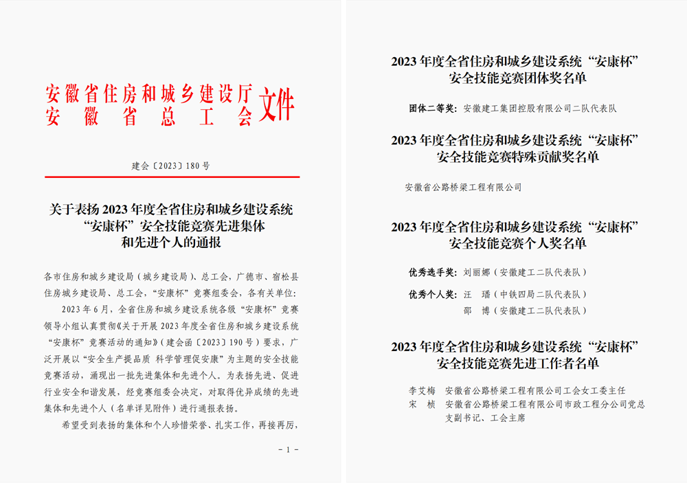 近日,安徽省总工会、住房城乡建设厅联合发布《关于表扬2023年度全省住房和城乡建设系统“安康杯”安全技能竞赛先进集体和先进个人的通报》,公司荣获竞赛特殊贡献奖,以公司选手为主力的安徽建工二队获得竞赛团体二等奖。公司职工宋桢、李艾梅获竞赛“先进工作者”,公司选手刘丽娜、邵博分获竞赛“优秀选手奖”“优秀个人奖”。