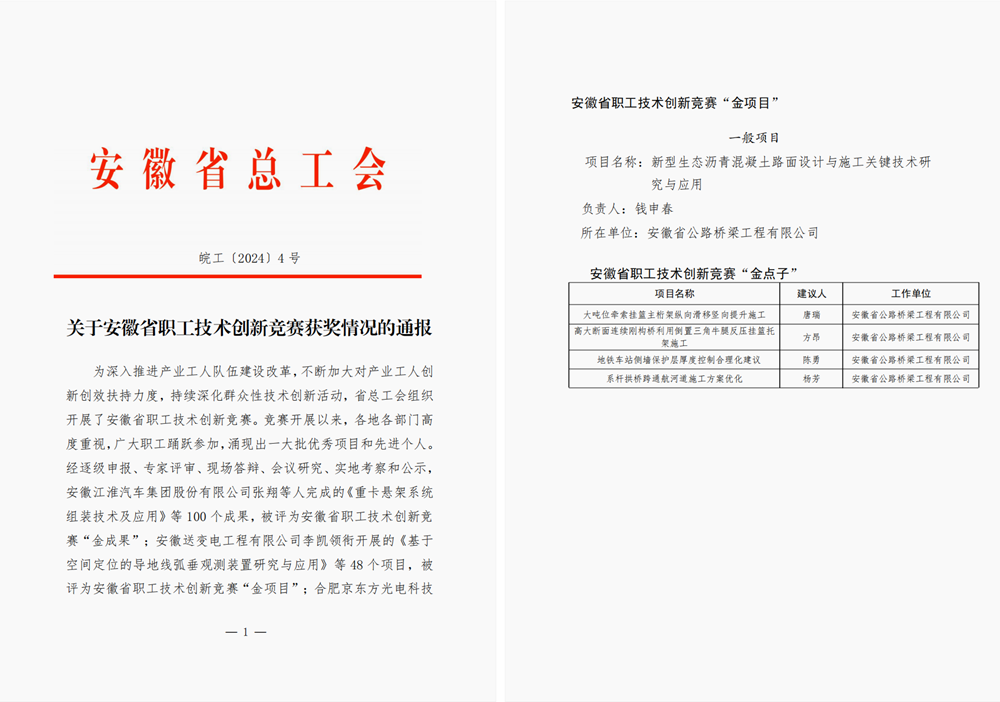 近日,安徽省总工会发布《关于安徽省职工技术创新竞赛获奖情况的通报》,公司报送的《新型生态沥青混凝土路面设计与施工关键技术研究与应用》获评“金项目”,《大吨位牵索挂篮主桁架纵向滑移竖向提升施工》等4项建议获评“金点子”。