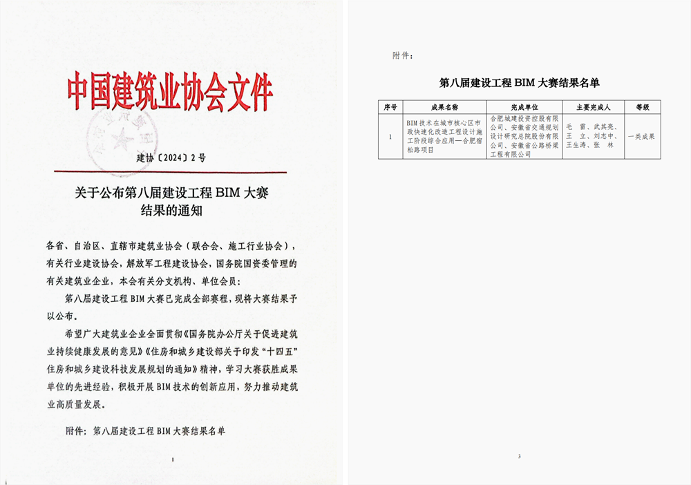 1月23日,中国建筑业协会发布了《关于公布第八届建设工程BIM大赛结果的通知》,公司承建的宿松路6标项目报送的“BIM技术在城市核心区市政快速化改造工程设计施工阶段综合应用—合肥宿松路项目”荣获一类成果。