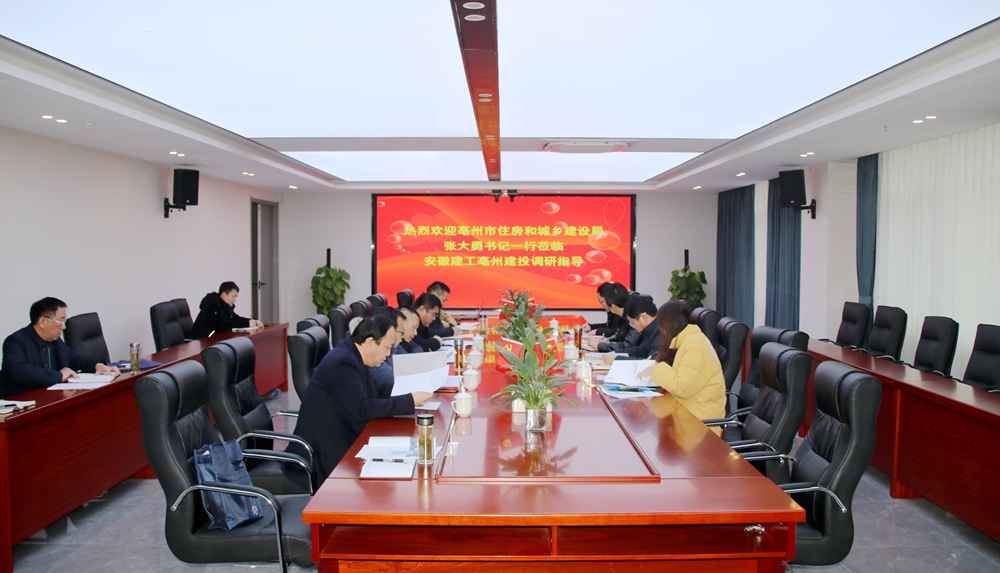 亳州市住房和城乡建设局党组书记张大勇到安徽建工亳州建投调研 发布时间:2024年03月07日 来源:建设公司 发布人:党委组织部(人力资源部、党委宣传部) 作者:褚祥 浏览:3987次 3月5日上午,亳州市住房和城乡建设局党组书记张大勇、副局长李彬一行到安徽建工亳州建投调研,详细了解亳州建投业务范围、发展规划等情况,并就深化双方合作提出希望。