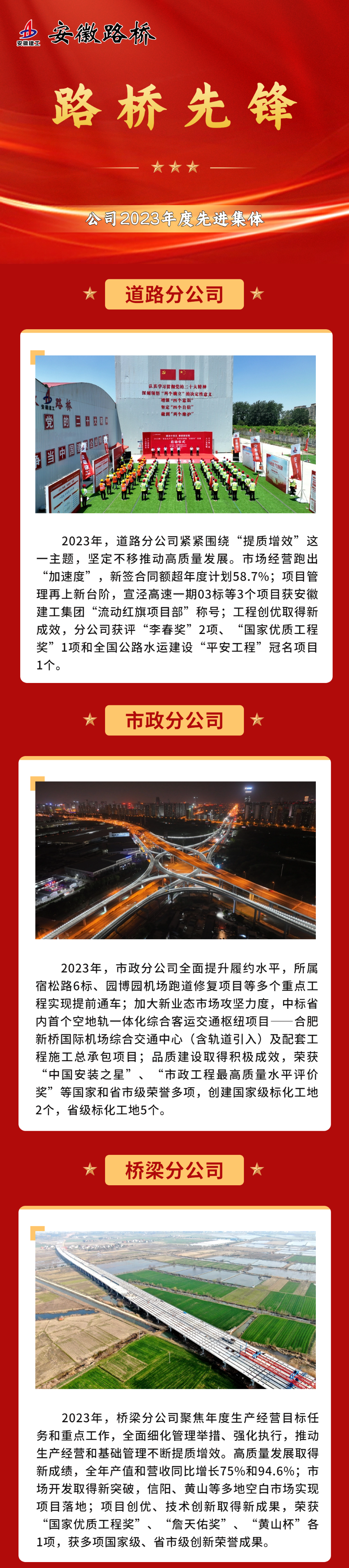 【路桥先锋】公司2023年度先进集体风采展示 发布时间:2024年03月15日 来源:党委组织部(人力资源部、党委宣传部)、所属各单位 发布人:党委组织部(人力资源部、党委宣传部) 作者: 浏览:2586次