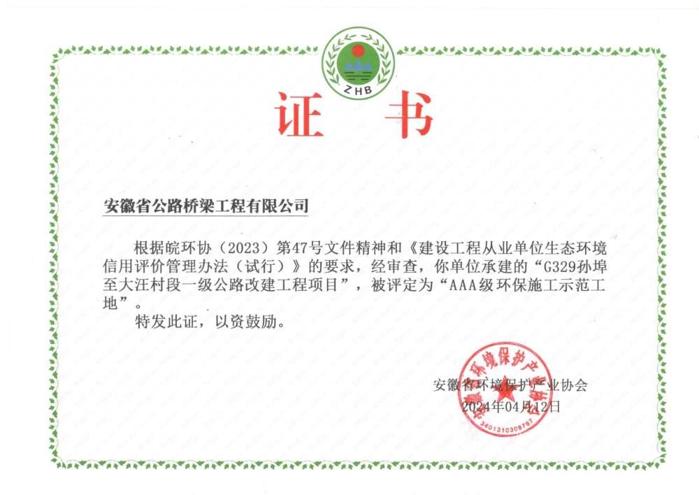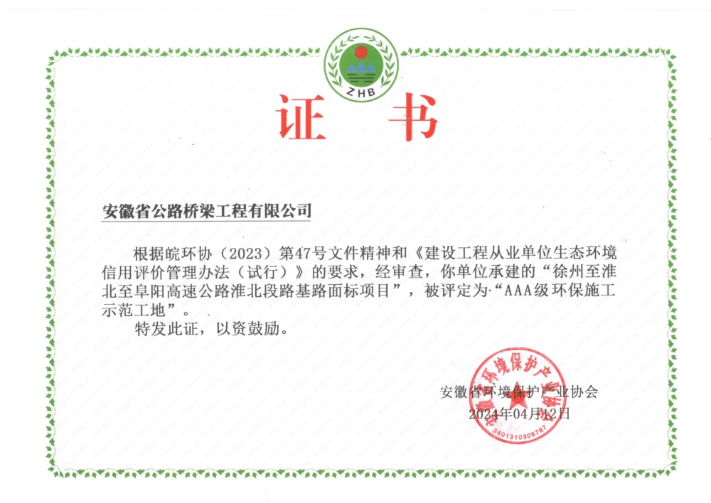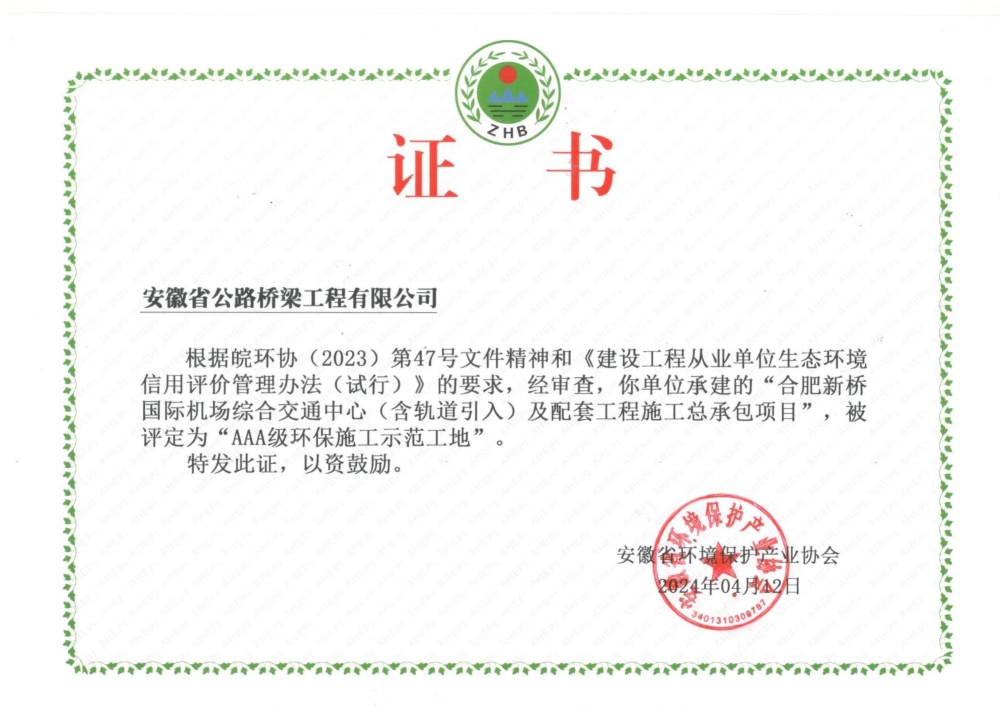 近日,安徽省环境保护产业协会公布了“2024年第2批建设工程从业单位生态环境信用评价结果”,由公司承建的徐州至淮北至阜阳高速公路淮北段路基路面标、G329孙埠至大汪村段一级公路改建工程和合肥新桥国际机场综合交通中心(含轨道引入)及配套工程施工总承包项目获评安徽省“AAA级环保施工示范工地”称号。
