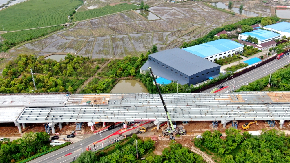 S330分离立交桥总长543米,其中钢板组合梁长185米,上跨S330省道,采用节段吊装施工方案,共分100个节段。自3月15日首片钢板组合梁吊装以来,项目部克服连续降雨、车流量大等不利因素,迎难而上,精心组织,安全稳步推进梁板架设工作,历经35天完成全部钢板组合梁吊装。