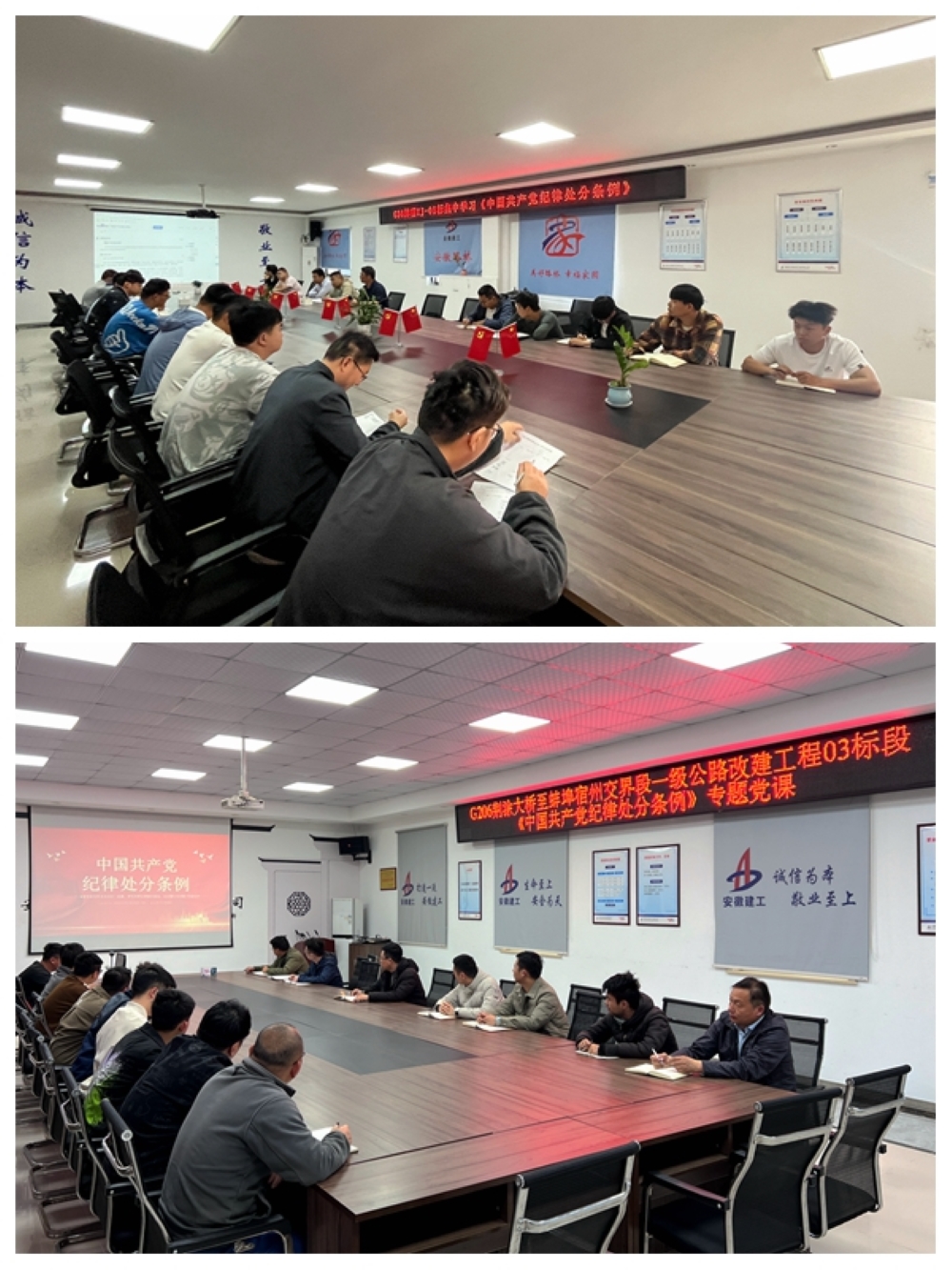 G36明蚌改扩建1标党支部、G206-03标项目党支部通过专题会议与党课,深度解析学习《中国共产党纪律处分条例》,将纪律内化于心、外化于行,促使纪律规范成为项目团队日常行为的自觉遵循。