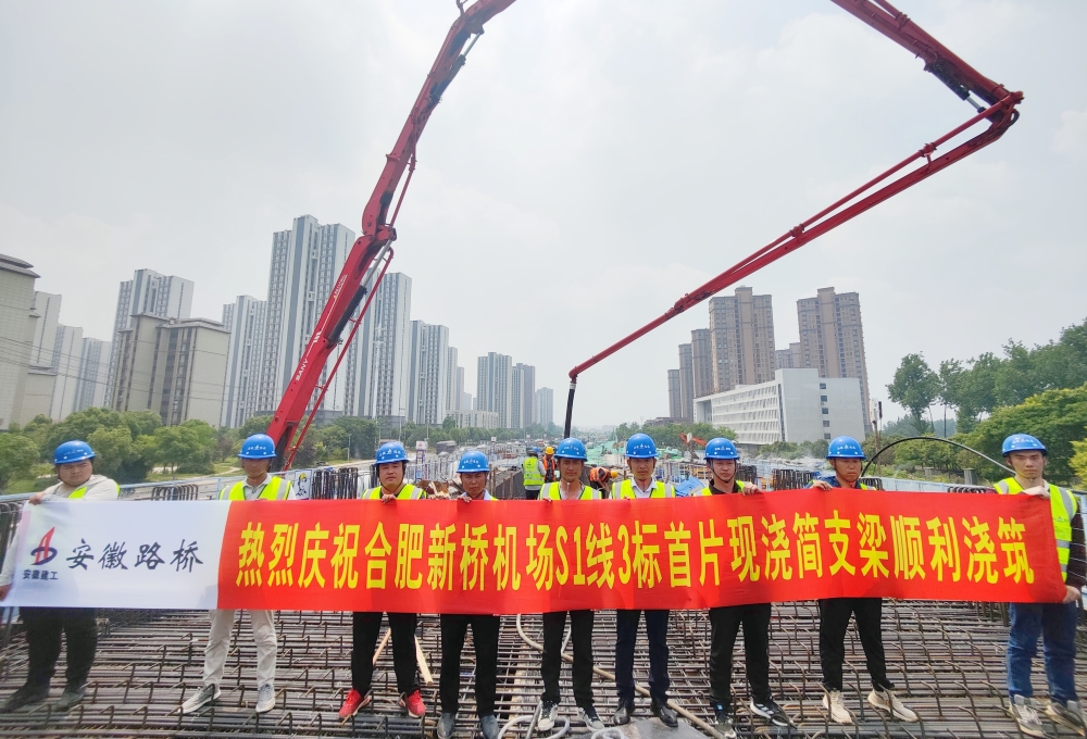 5月24日上午,合肥新桥机场S1线3标高架段首跨现浇简支梁完成浇筑,项目建设进入桥梁上部结构施工阶段。