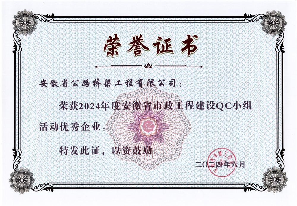 近日,在合肥开展的安徽省市政工程协会2024年度工程建设优秀QC小组活动交流会上,公司多项QC课题成功斩获优秀QC成果奖。同时,公司荣获了2024年度安徽省市政工程建设QC小组活动优秀企业称号。