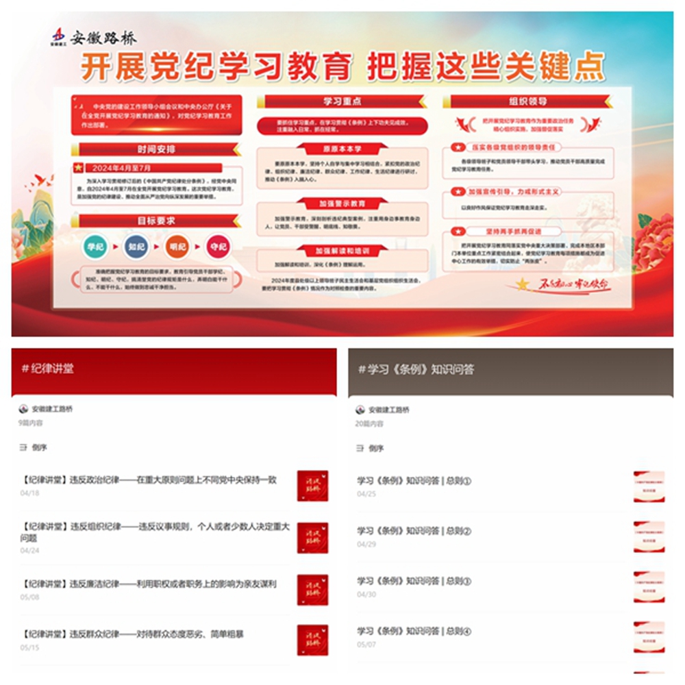 党纪学习教育开展以来,公司党委高度重视宣传引导、氛围提升。为扩大宣传引导的接触面,公司党委统筹制定发布了党纪学习教育展板。同时,立足“清风路桥”建设,加大宣传力度,综合运用官网、官微,设立“纪律讲堂”“学习《条例》知识问答”等专栏,累计推出党纪学习教育相关报道和学习材料80余篇次,做到“每日推送”。组织全体党员职工参加公司内网《条例》线上知识测试,以考助学、以训促学,巩固学习成果,检验学习成效,在全公司营造学纪、知纪、明纪、守纪的良好氛围。各级党组织通过“三会一课”等方式开展专题学习230余次,受教育党员、职工累计超2500人次。