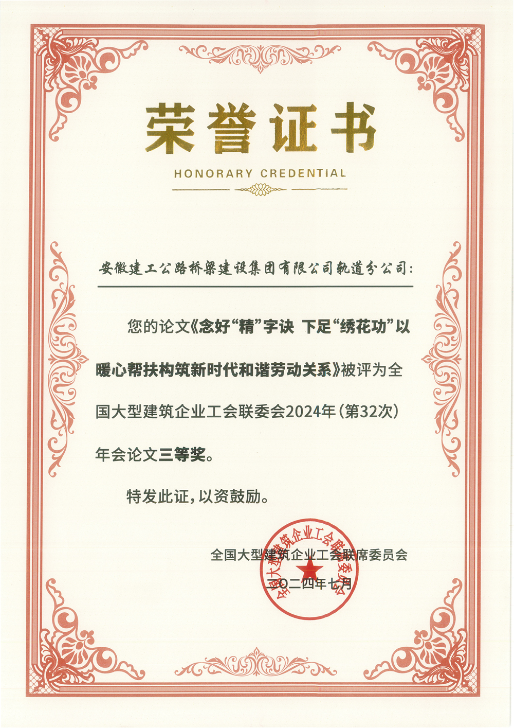 近日,全国大型建筑企业工会联委会2024年年会在新疆乌鲁木齐召开,轨道分公司报送的论文《念好“精”字诀 下足“绣花功” 以暖心帮扶构筑新时代和谐劳动关系》被评为三等奖。