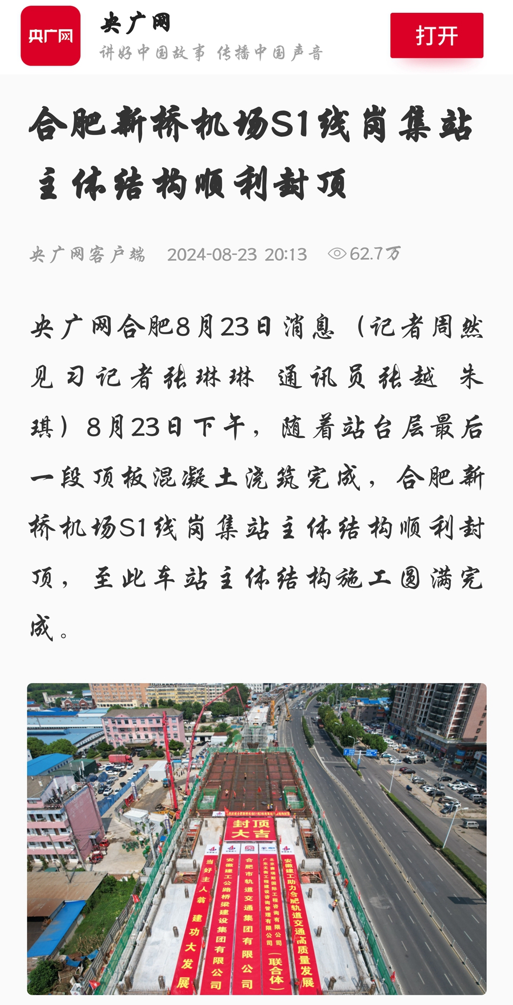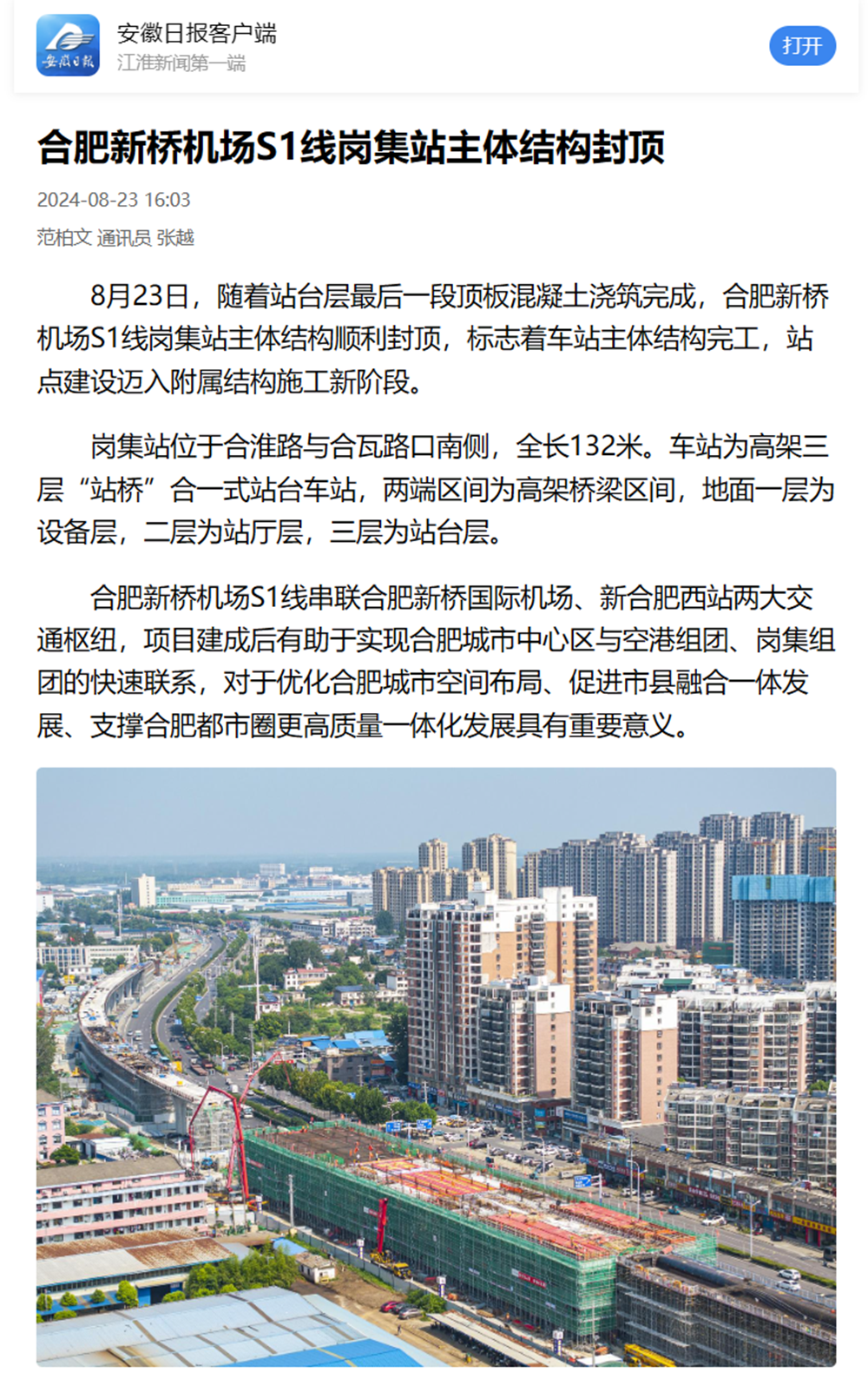 【名媒聚焦】央广网、中安在线、安徽日报等主流媒体聚焦合肥新桥机场S1线项目岗集站主体结构封顶