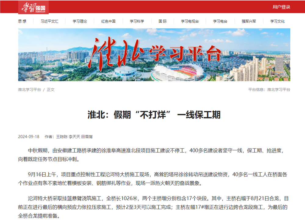 【名媒聚焦】多家主流媒体聚焦报道建工路桥项目建设 发布时间:2024年09月19日 来源:所属各单位 发布人:党委组织部(人力资源部、党委宣传部) 作者: 浏览:3511次 中秋假期,安徽建工路桥建设者坚守岗位一线,抢抓施工“黄金期”,冲刺节点目标,跑出实干“加速度”,受到多家主流媒体聚焦报道。学习强国淮北新闻联播淮北日报合肥新闻联播合肥新闻联播