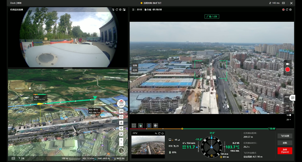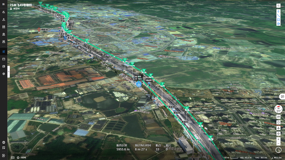 质量是工程的生命线。无人机巡检系统,为质量安全擦亮智慧“双眼”。“我们把无人机巡检与GIS+BIM技术相结合,对项目全线每月更新GIS数据,形成虚实互联的电子沙盘,真实还原现场工程建设场景。”余明君介绍,操控人员仅需远程下达巡检任务,即可实现起飞、巡检、降落、回收、充电、数据上传等一系列自动操作,同时集成测量分析、重要部位重点标注等功能,自动巡检无人值守、自动作业,还支持夜间红外巡逻,“方寸屏幕间即可窥见施工全线场景。”