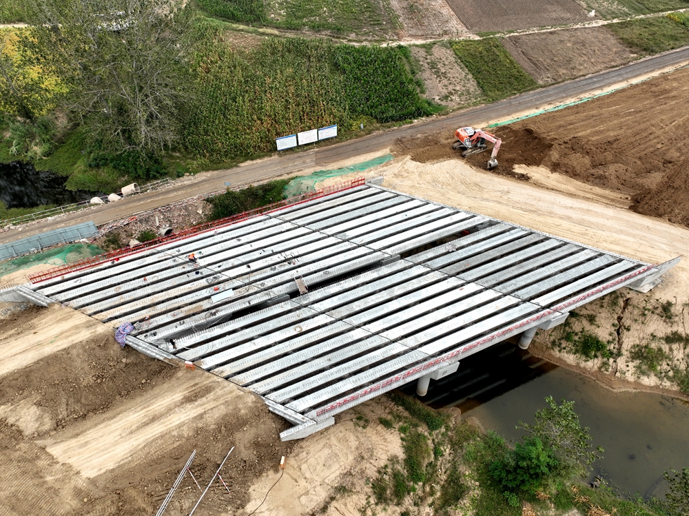 随着最后一片梁板精准落位,徐淮阜高速亳州段路基02标主线桥梁板架设任务顺利完成,项目主线桥全面进入桥面系及护栏施工阶段。
