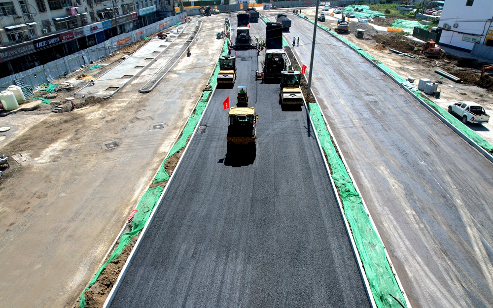 在肥西市政项目,项目团队抢抓晴好天气,人员机械密切配合,推动创新大道、云谷路全面进入沥青摊铺施工阶段,提前完成计划产值。
