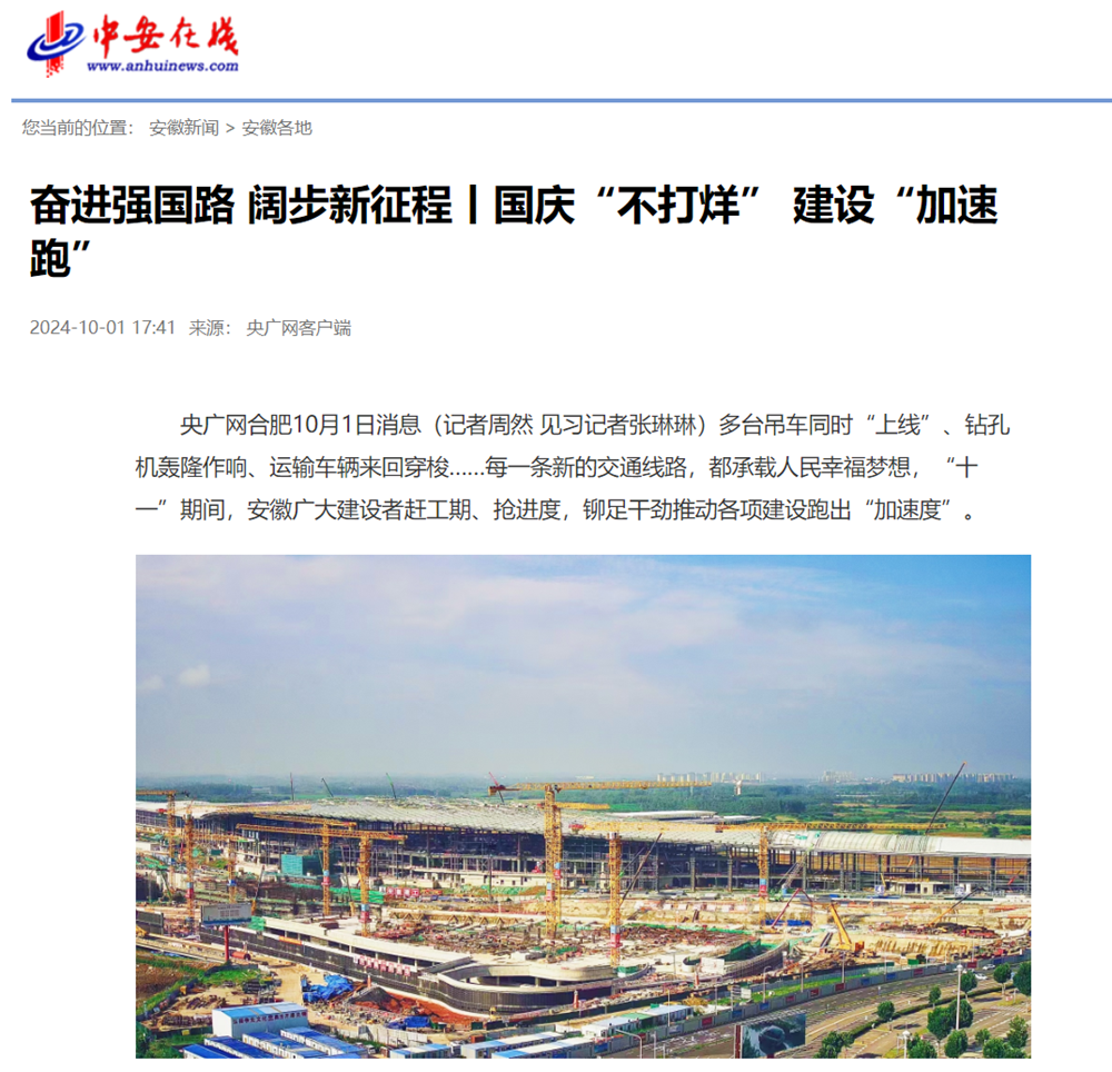 国庆假期,公司所属各重点项目“不打烊”,推动项目建设“加速跑”,受到中央广播电视总台、新华社、央广网、安徽卫视、中安在线等国家和省部级主流媒体聚焦报道。