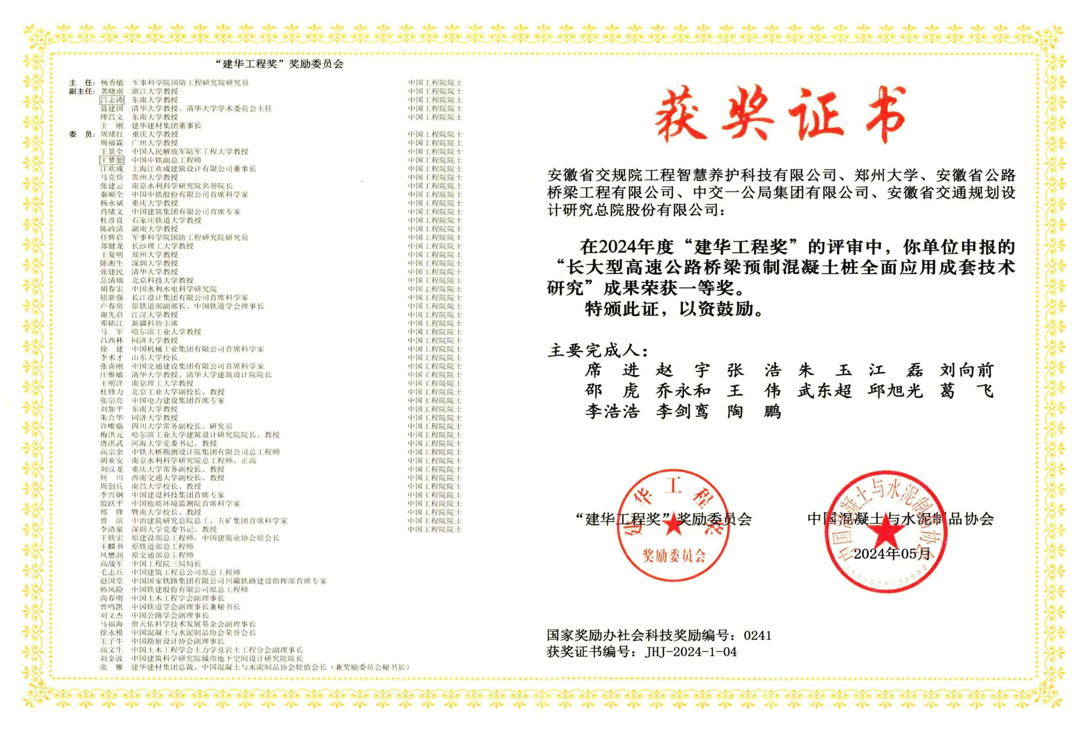 近日,中国混凝土与水泥制品协会颁发了2024年度“建华工程奖”,公司申报的《长大型高速公路桥梁预制混凝土桩全面应用成套技术研究》成果荣获一等奖。