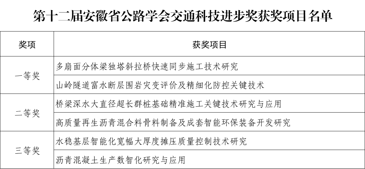 近日,安徽省公路学会八届三次理事会在宣城召开,会上表彰了第十二届安徽交通科技进步奖获奖项目及2024年度先进单位。公司申报的6项科研项目成果分别荣获一、二、三等奖,公司荣获2024年度先进会员单位。