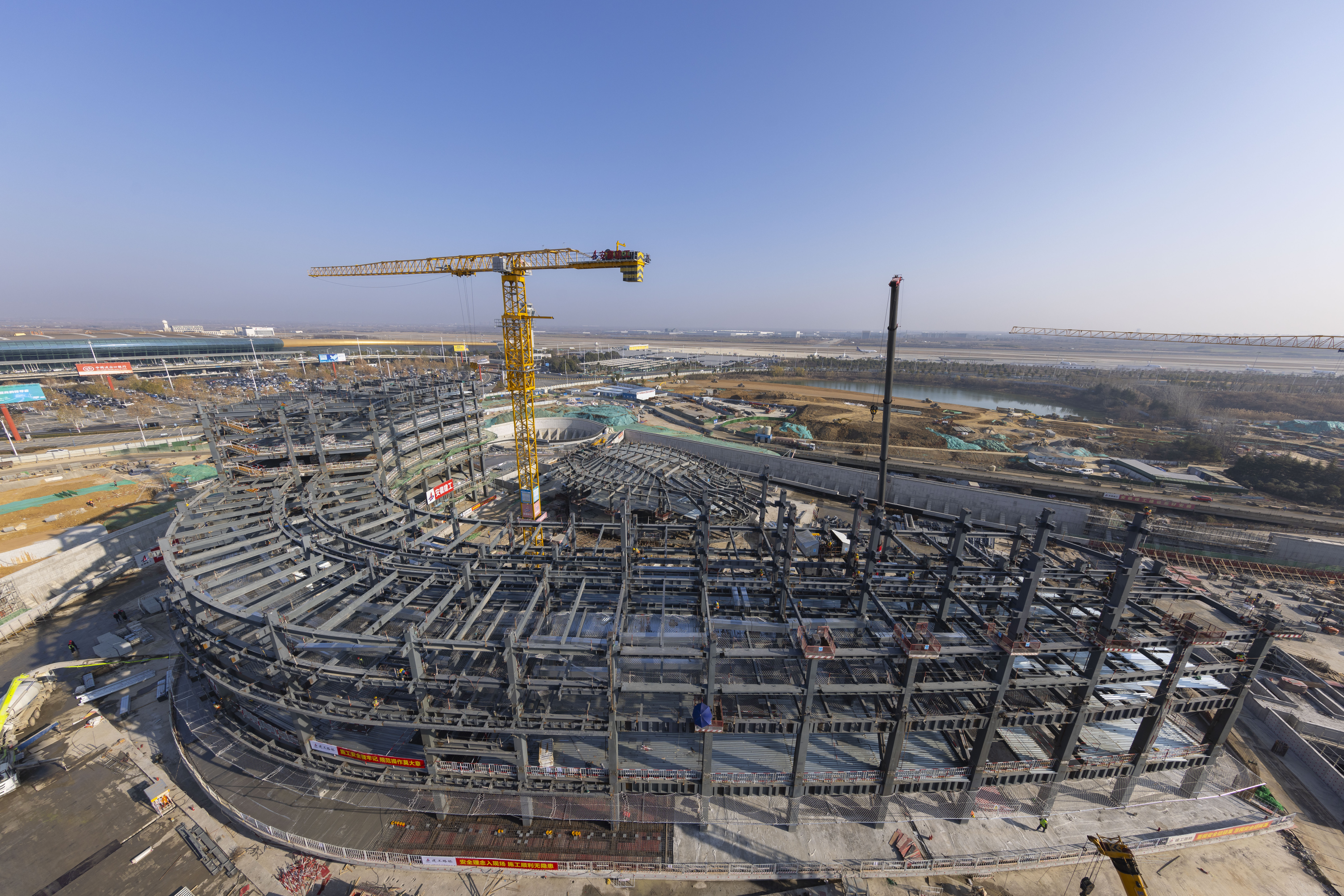 1月5日,合肥新桥国际机场改扩建工程现场,安徽建工集团的工人正在施工。当前合肥新桥国际机场改扩建工程正稳步推进中。T2航站楼正全面推进屋面钢结构、幕墙和二次结构砌筑施工,同步推进机电安装。综合交通中心项目主体结构已全面封顶。