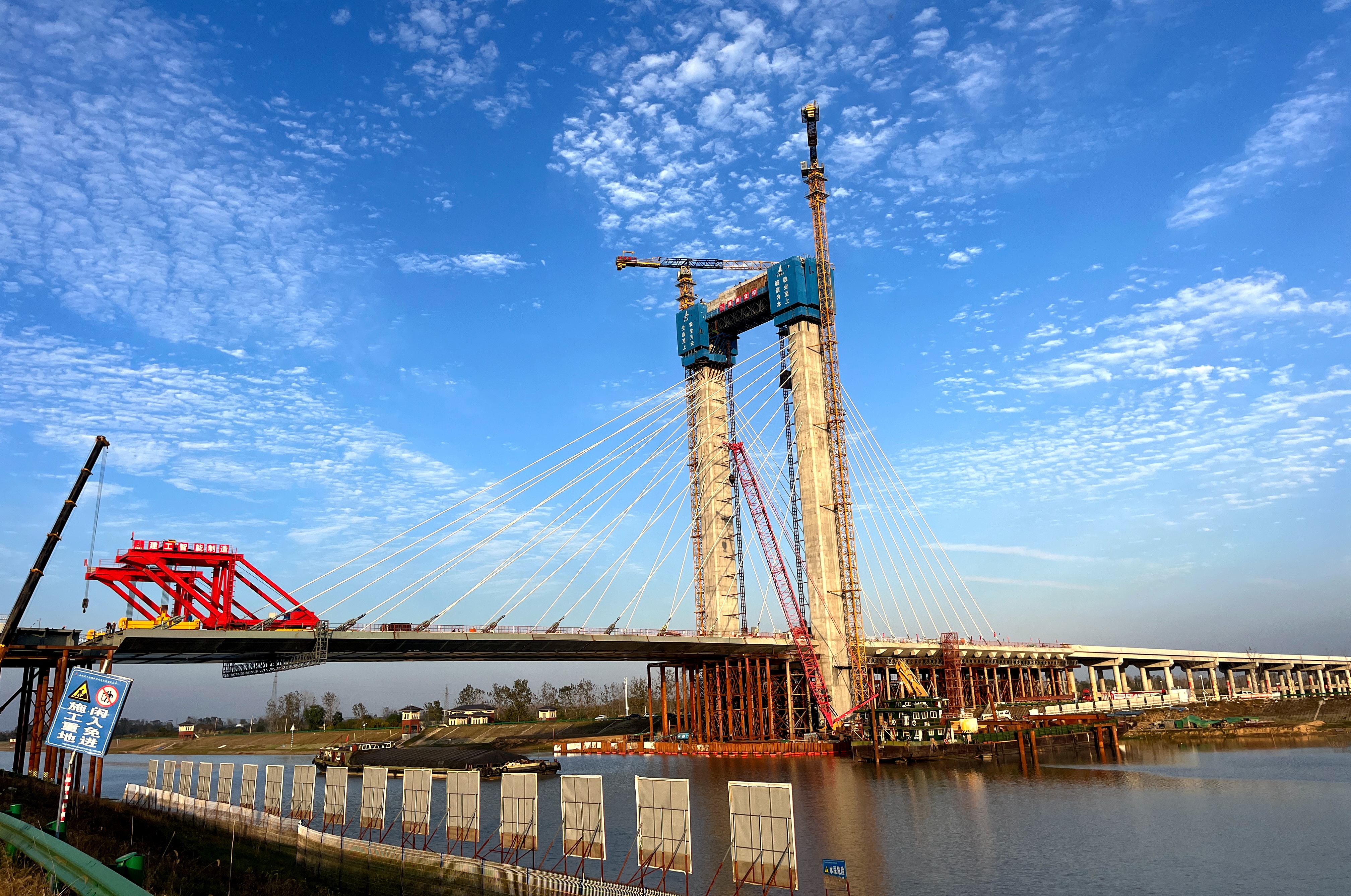 “东淝河特大桥跨河主桥长161米,共13节梁段,钢箱梁总重约4000吨。如果单纯依靠吊装作业,则存在较高的安全风险。”安徽建工路桥S16合周高速寿县刘岗至保义段路基4标项目党支部书记何涛回忆道,针对东淝河特大桥主桥施工,项目团队根据现场施工条件,经过充分论证,采取“塔梁同步”施工方案,同时调整了合龙段的位置,涉河段钢箱梁利用桥面吊机安装、河滩部位采用搭设支架,吊机分块安装,由两端向中间同步进行,仅用两个半月时间就高质量完成了主桥钢箱梁的安装任务,较合同工期提前近10个月时间。