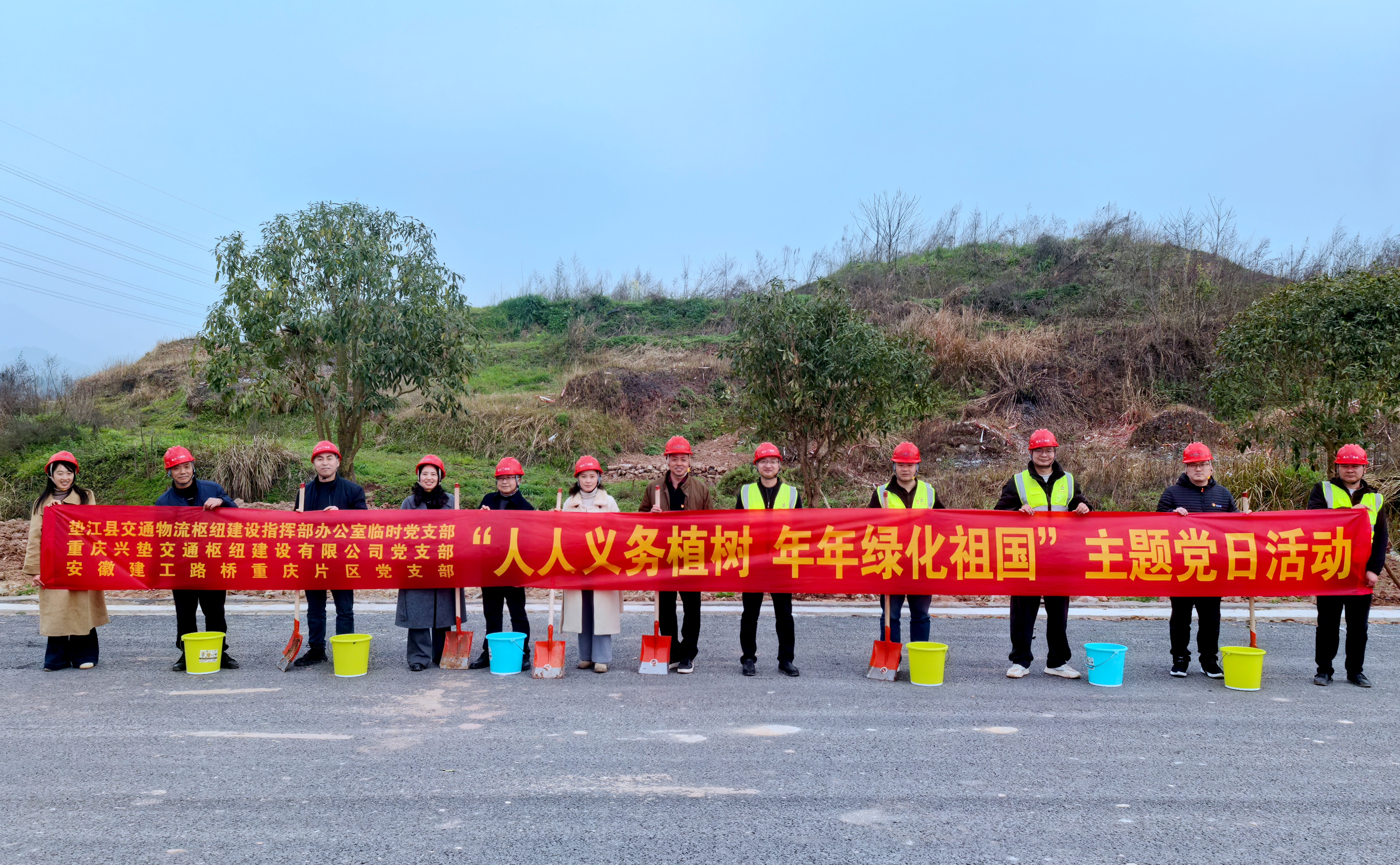 重庆片区党支部与业主单位联合开展“人人义务植树、年年绿化祖国”主题党日活动,大家挥动铁锹铲土、扶正树苗、固定根部、培土围堰……为初春的大地注入了新的活力。