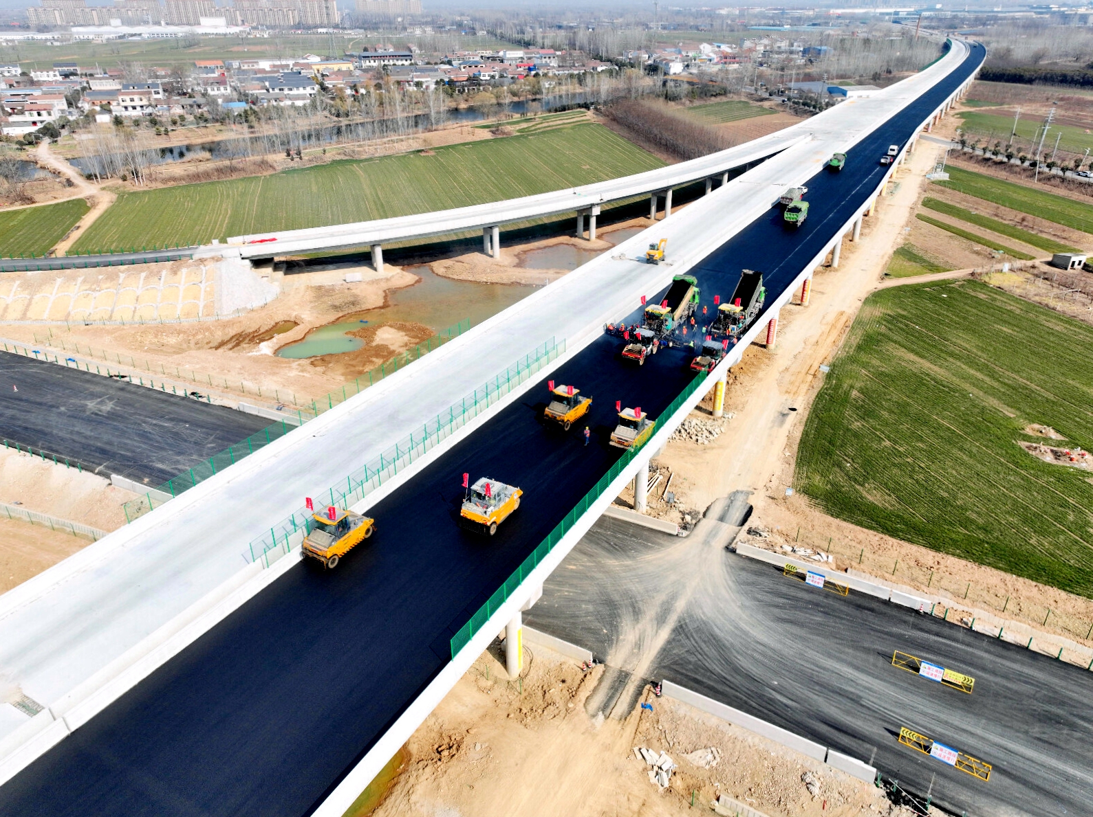 在徐淮阜高速淮北段,项目锚定7月通车目标,坚持节假日施工“不断档”,顺利完成全线水稳摊铺施工,正加速推进沥青路面施工。