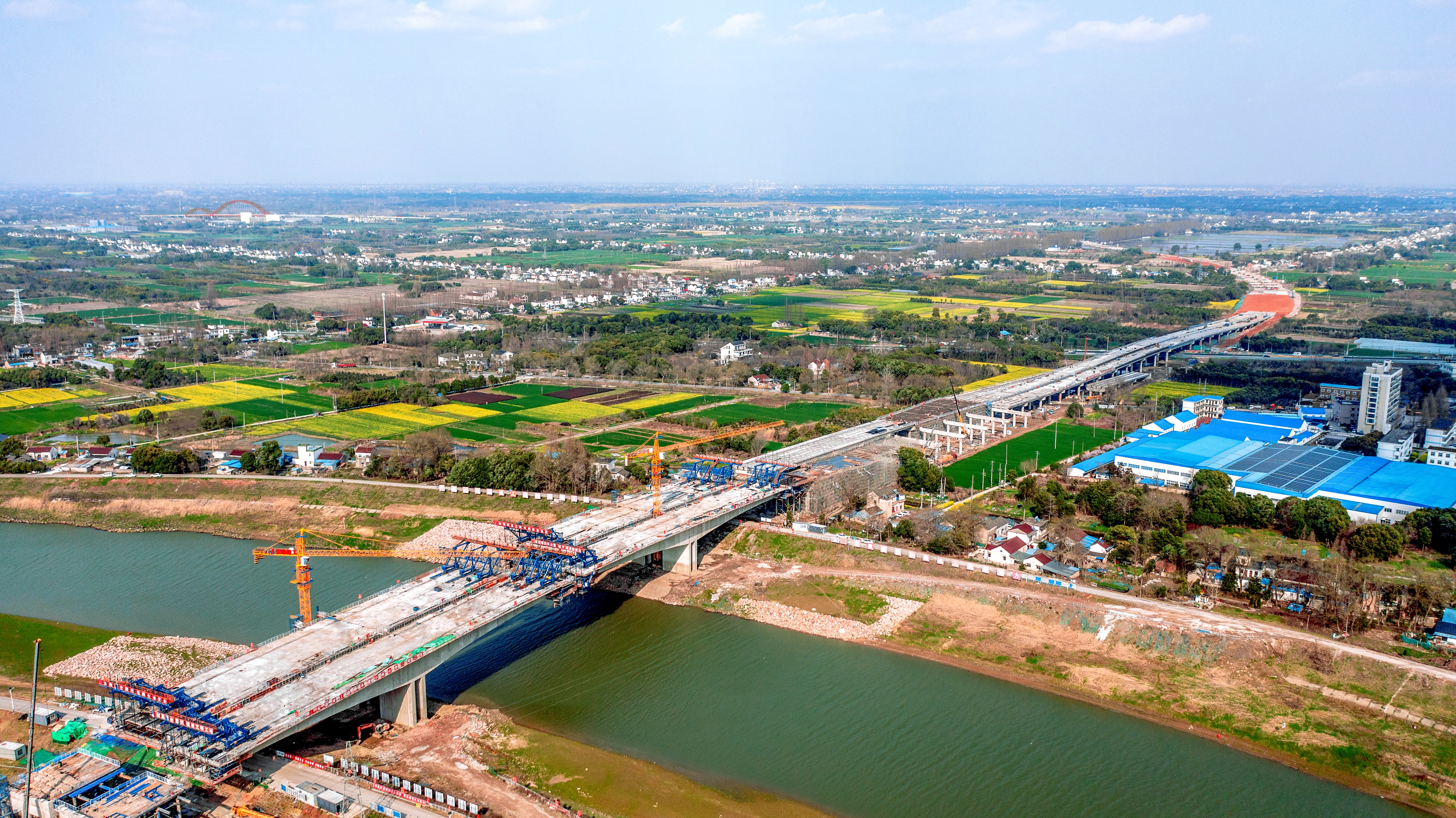 在芜湖青弋江畔,S334峨山路东延伸新建二期工程青弋江特大桥东引桥左幅已顺利贯通,主桥现浇施工紧锣密鼓推进,确保如期实现4月份主桥合龙和年底主线贯通目标。